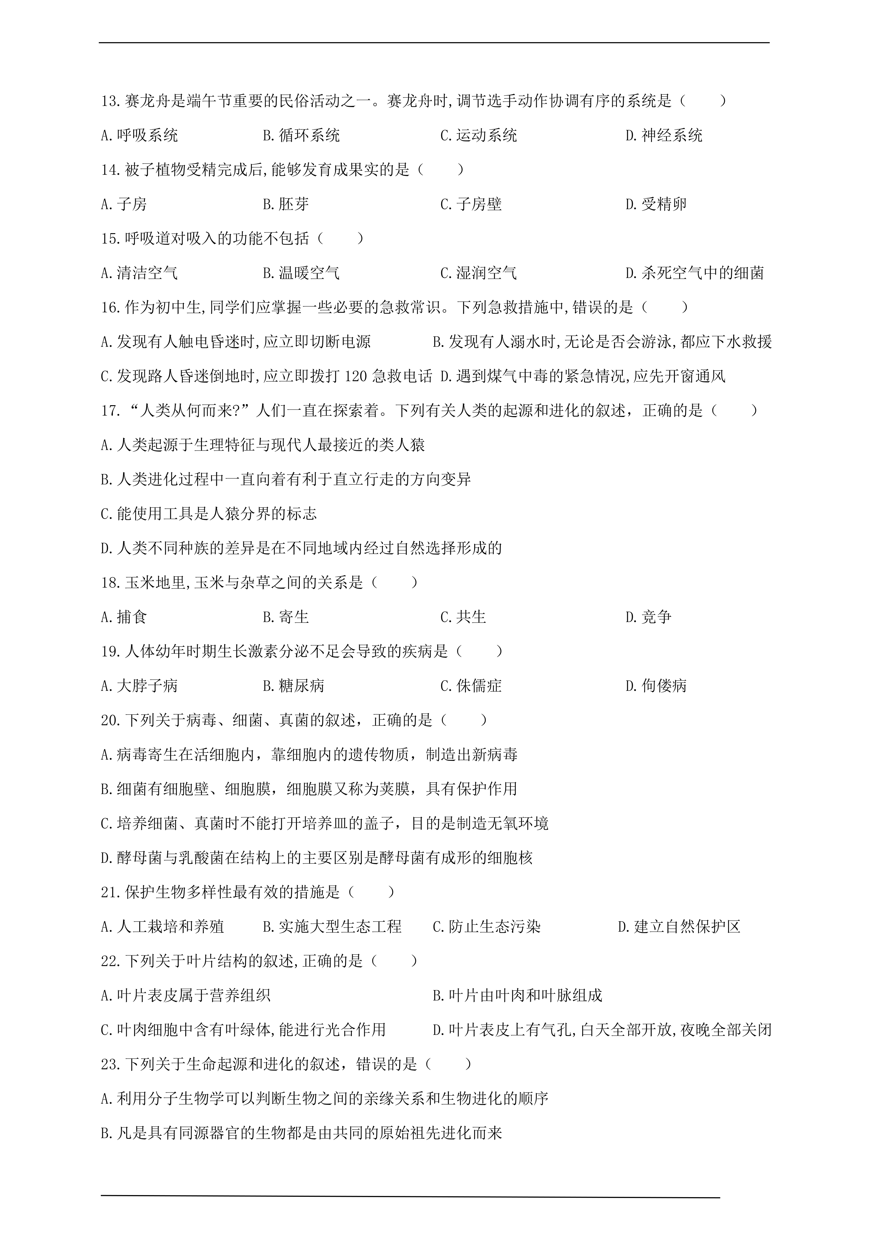 山东省济南市2024年中考生物真题