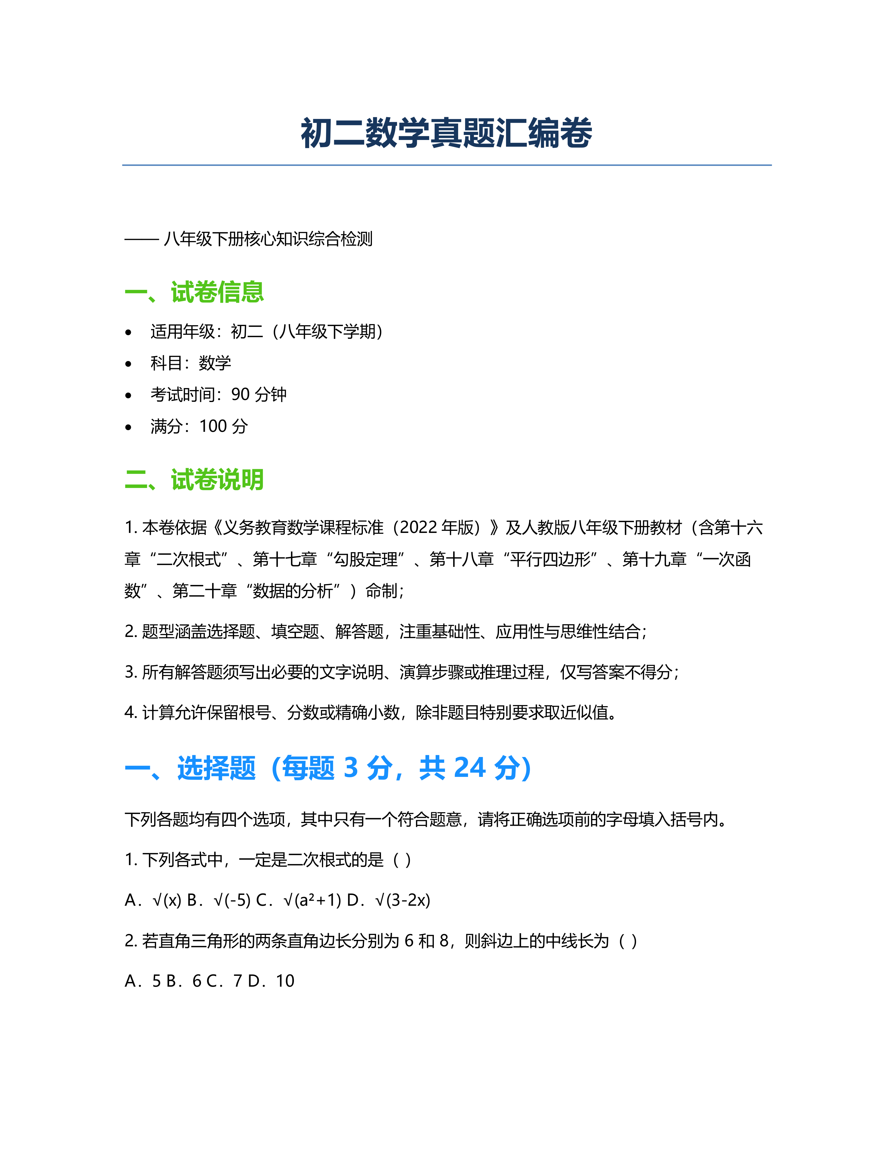 初二数学真题汇编卷