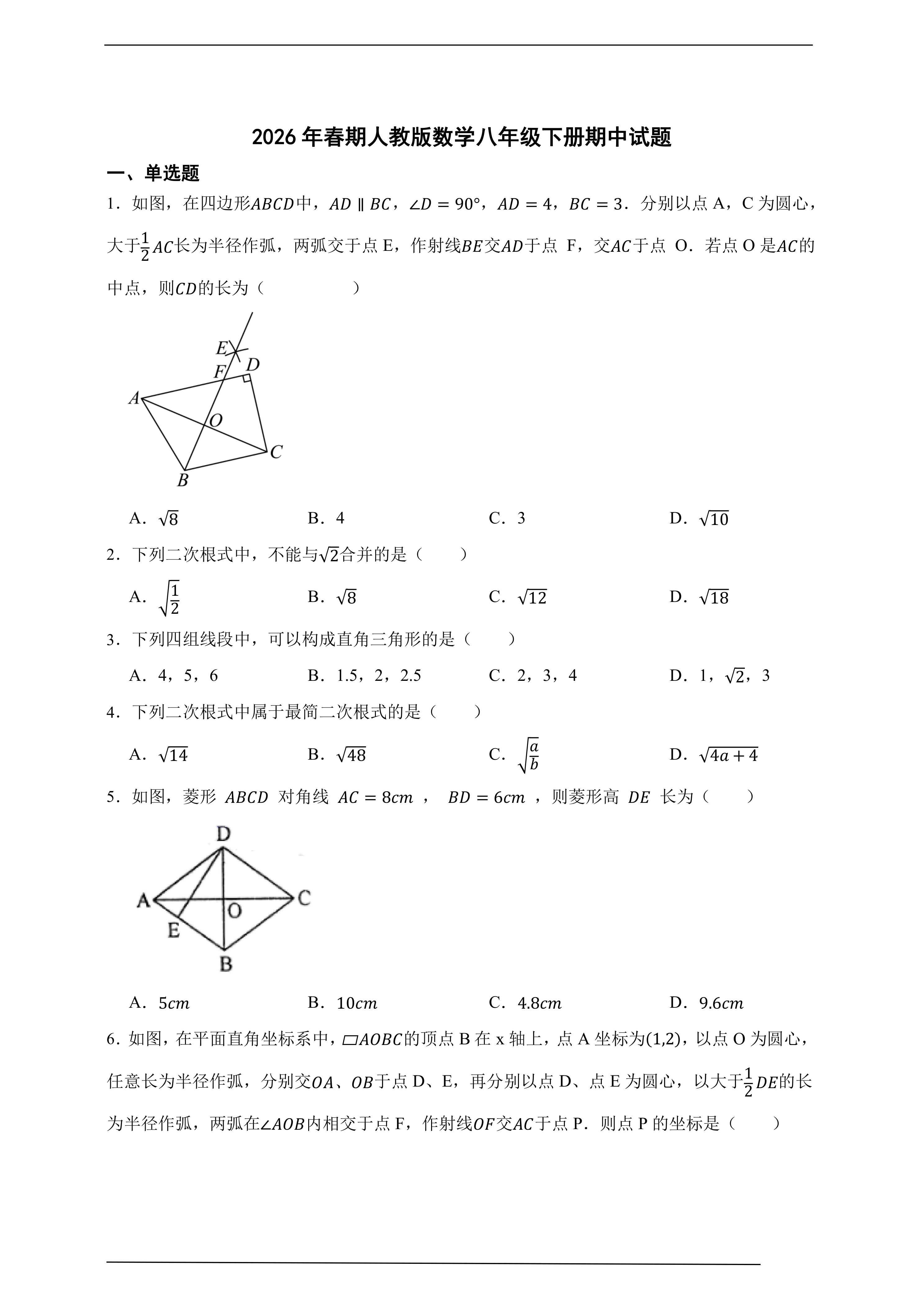 2026年春期人教版数学八年级下册期中试题(含答案)