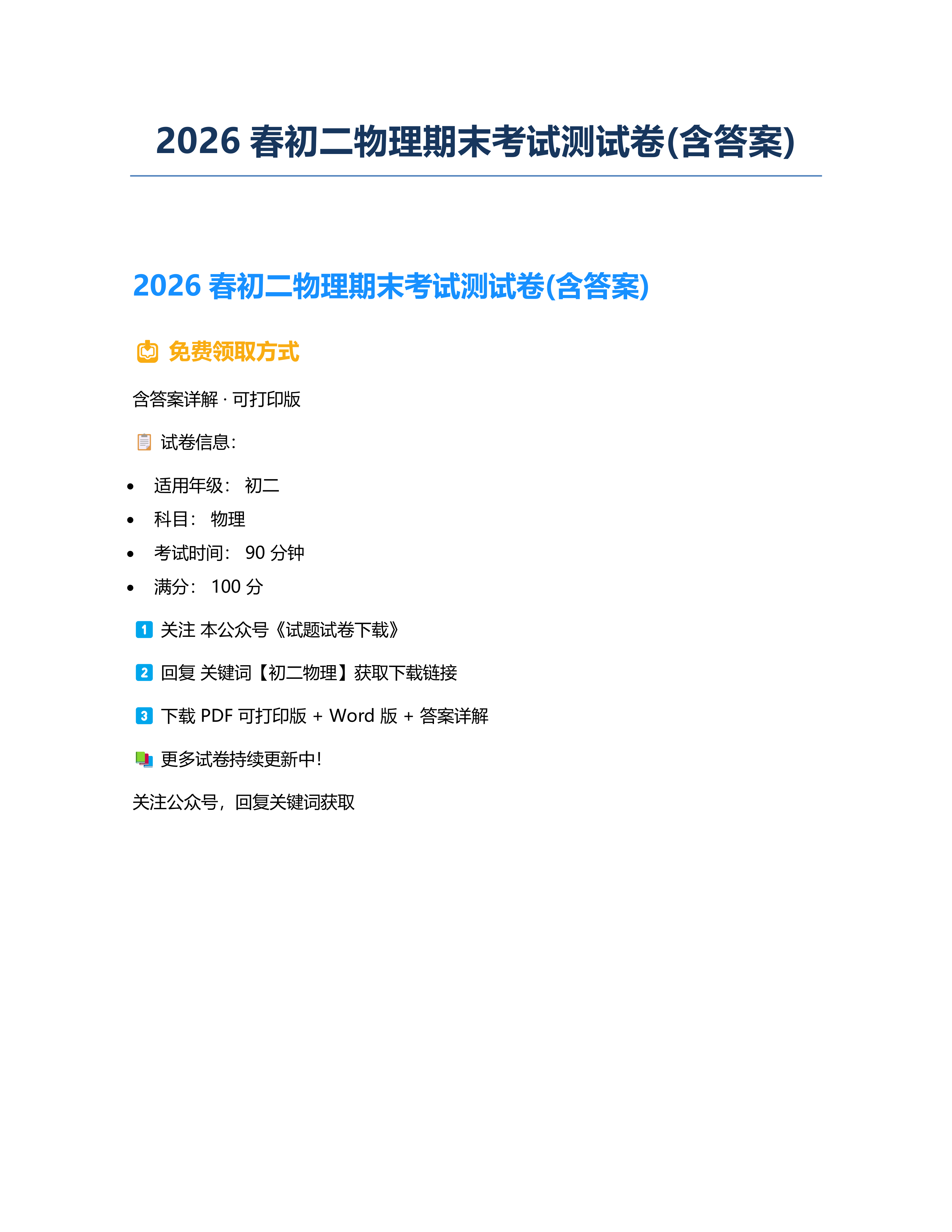 2026春初二物理期末考试测试卷(