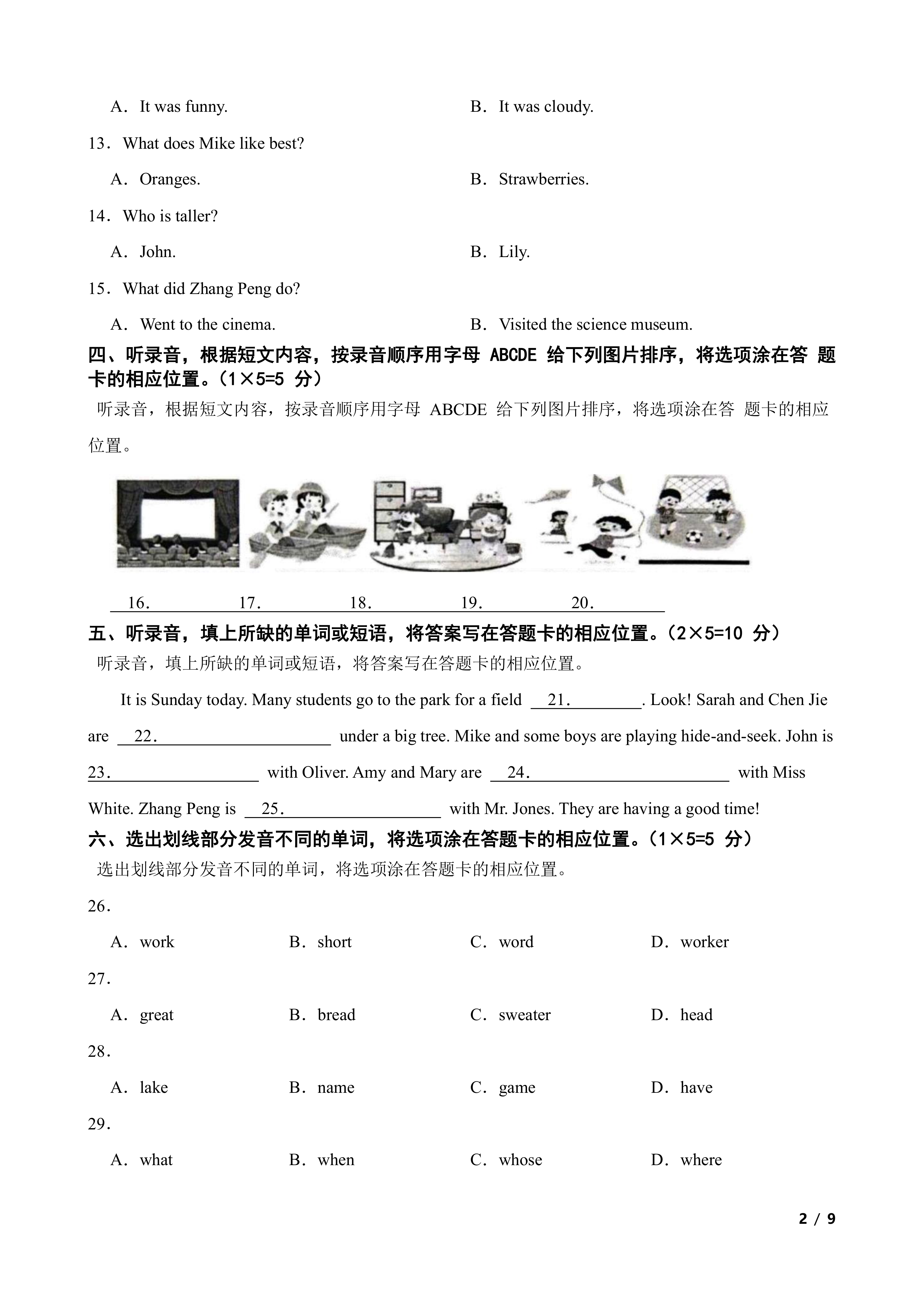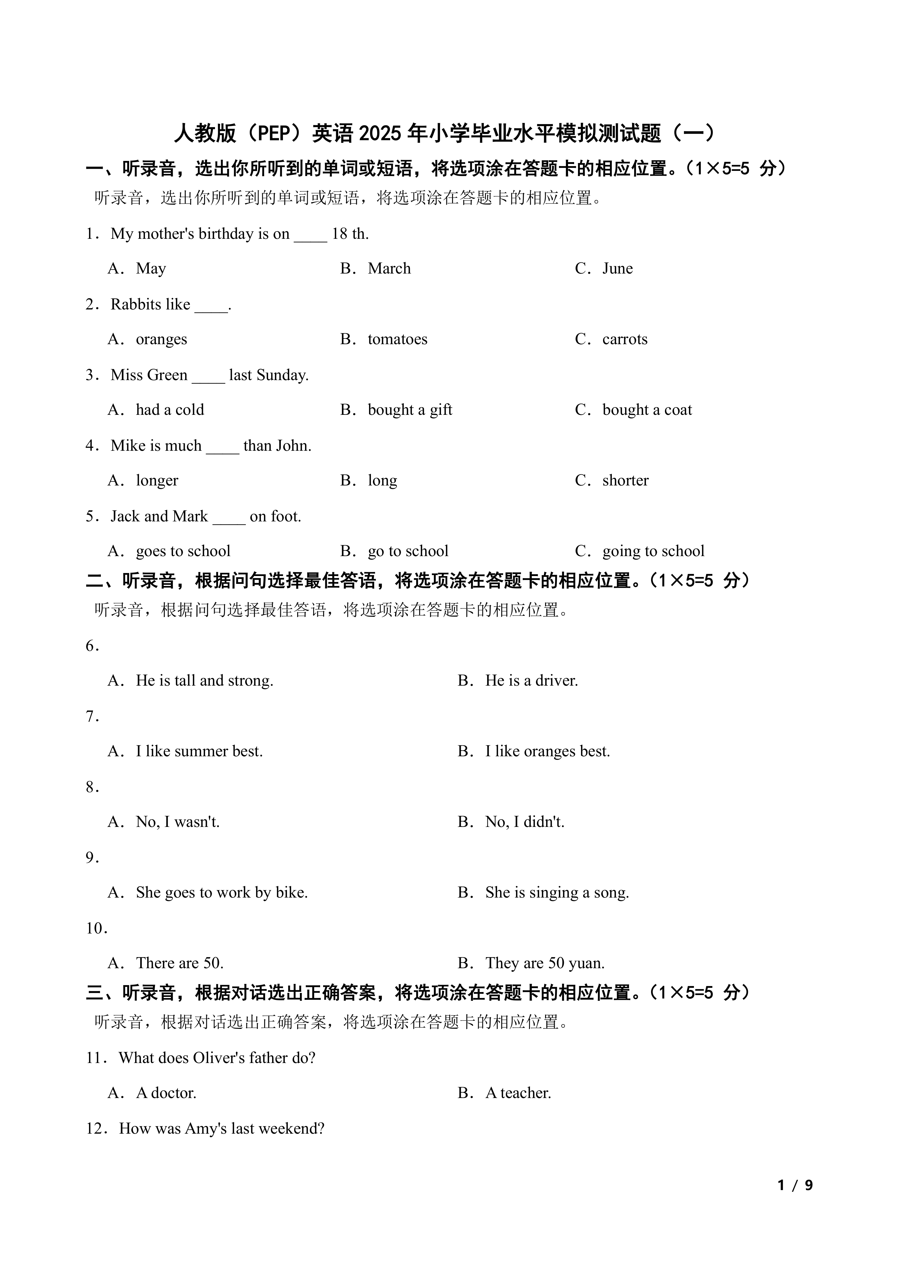 人教版(PEP)英语2025年小学毕业水平模拟测试题(一) 时间:2026-04-01 热度:°C 加入收藏 我要投稿 点赞() 人教版PEP 播放听力 播放听力 上一篇:2026春季学期六年级英语期中考试试卷(完整版) 下一篇:返回列表
