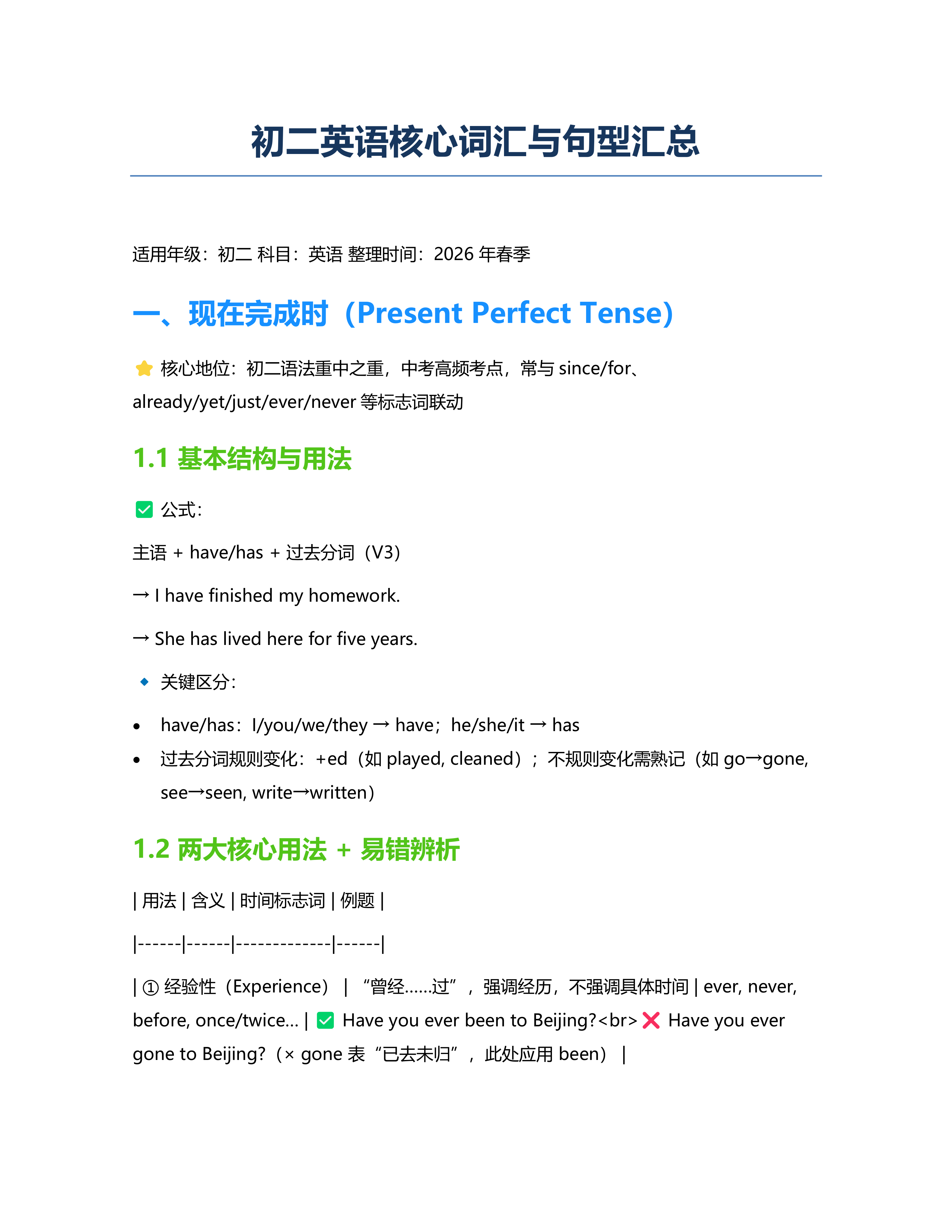 初二英语核心词汇与句型汇总