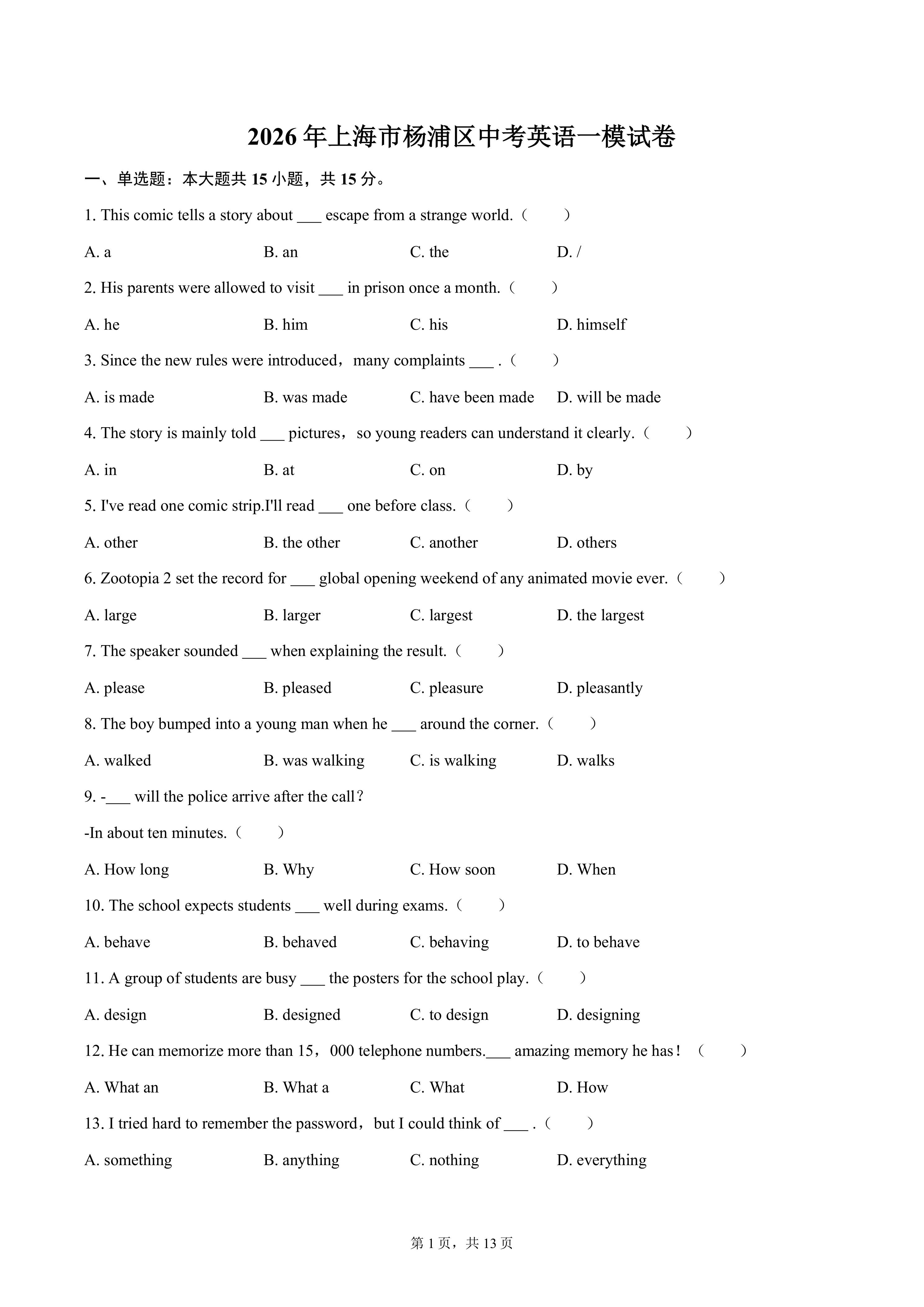2026年上海市杨浦区中考英语一模试卷(含答案) 时间:2026-04-08 热度:°C 加入收藏 我要投稿 点赞() 杨浦区2026 上一篇:2026年上海静安区初三中考一模:英语作文解析(老物件介绍演讲稿) 下一篇:返回列表