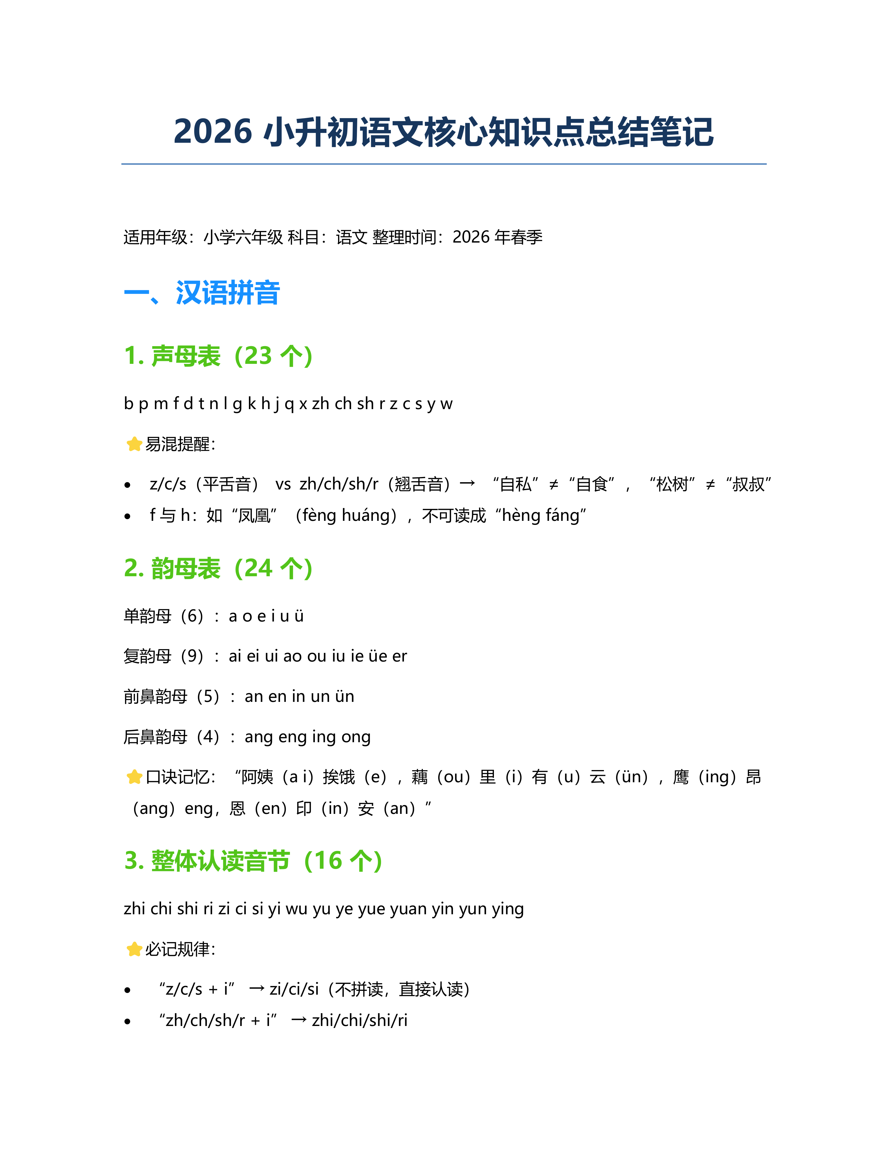 2026小升初语文核心知识点总结笔