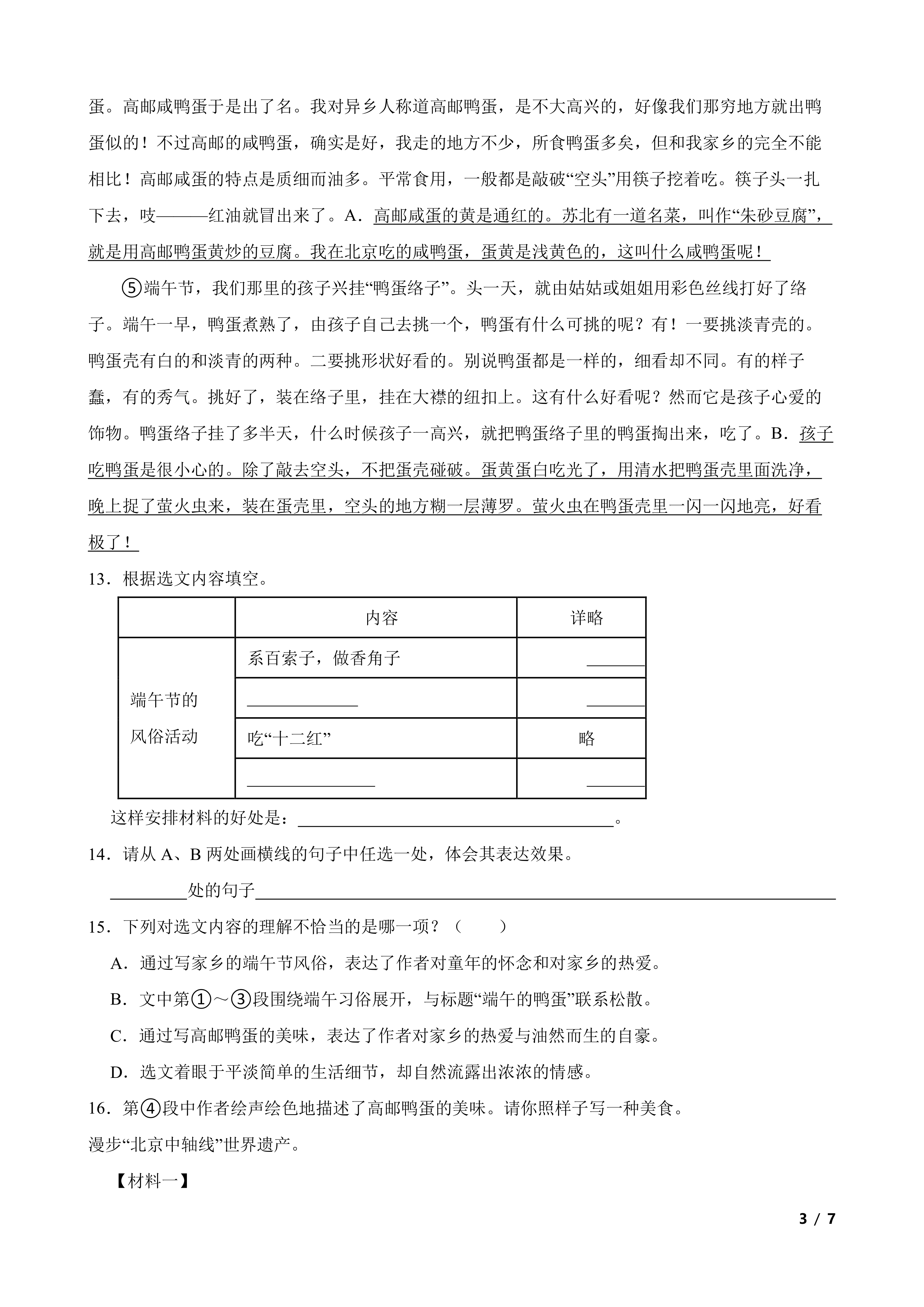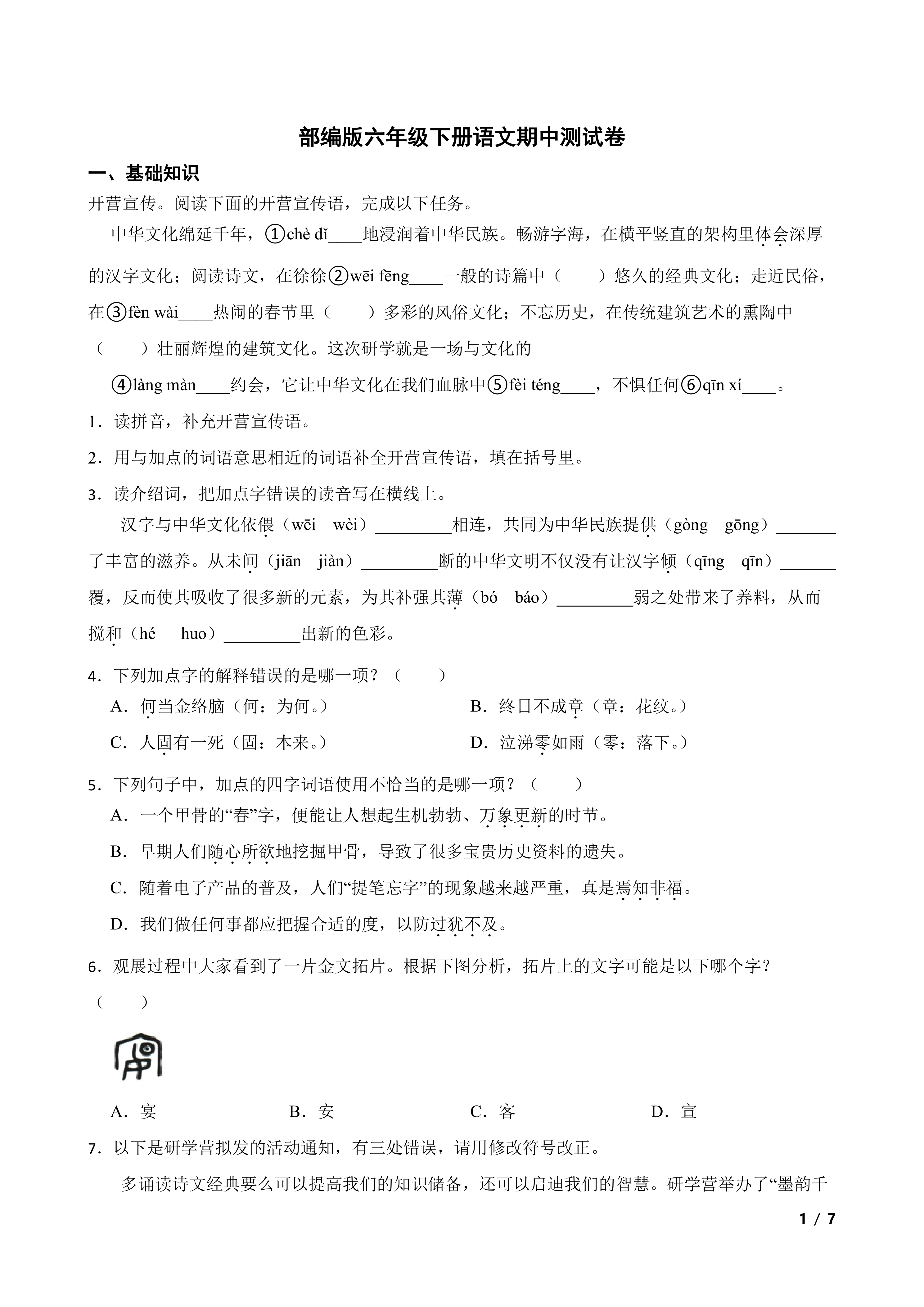 部编版六年级下册语文期中测试卷