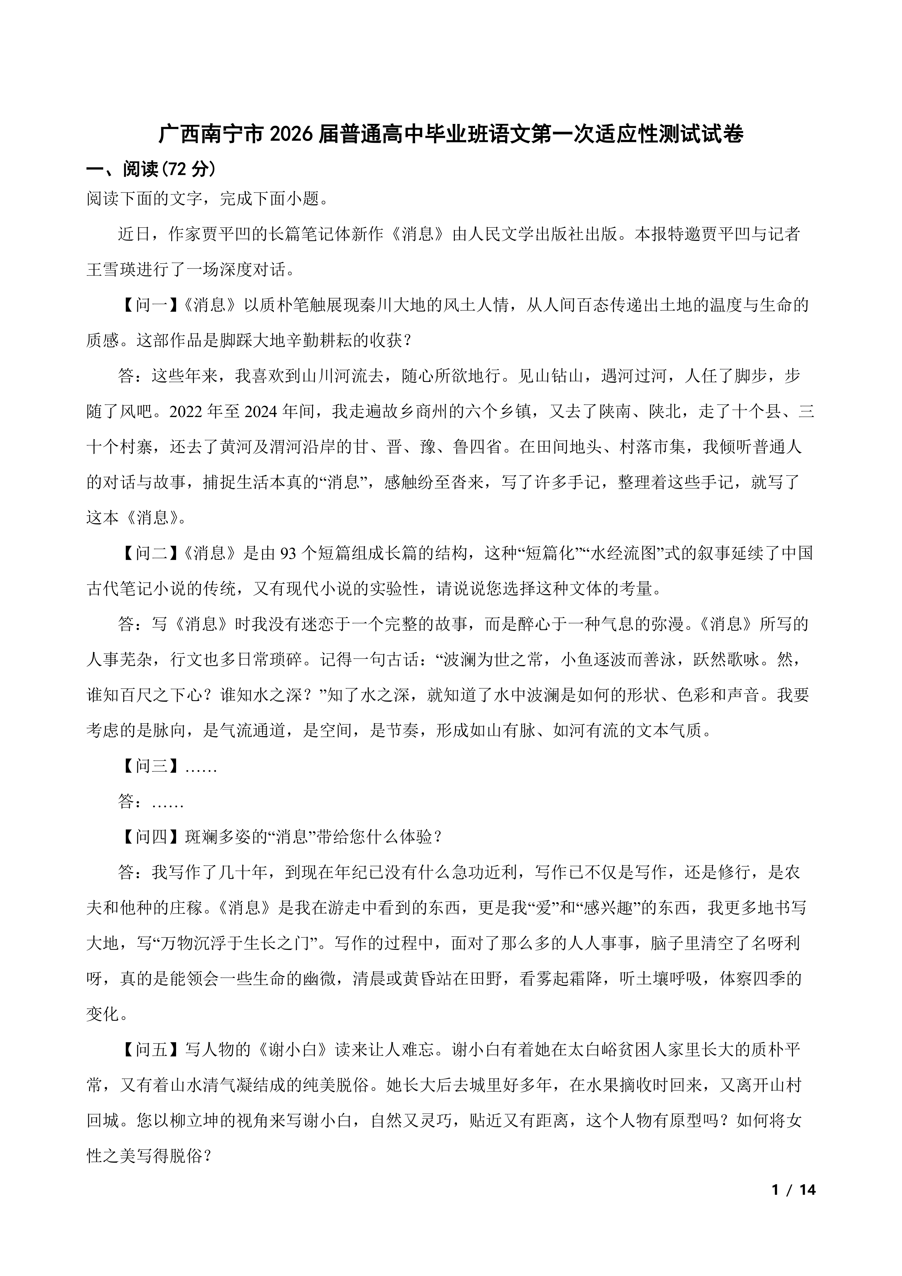 广西南宁市2026届普通高中毕业班语文第一次适应性测试试卷 时间:2026-04-03 热度:°C 加入收藏 我要投稿 点赞() 2026普通高中 上一篇:广东省梅州市2026届高三语文总复习质检(一模)试卷 下一篇:返回列表