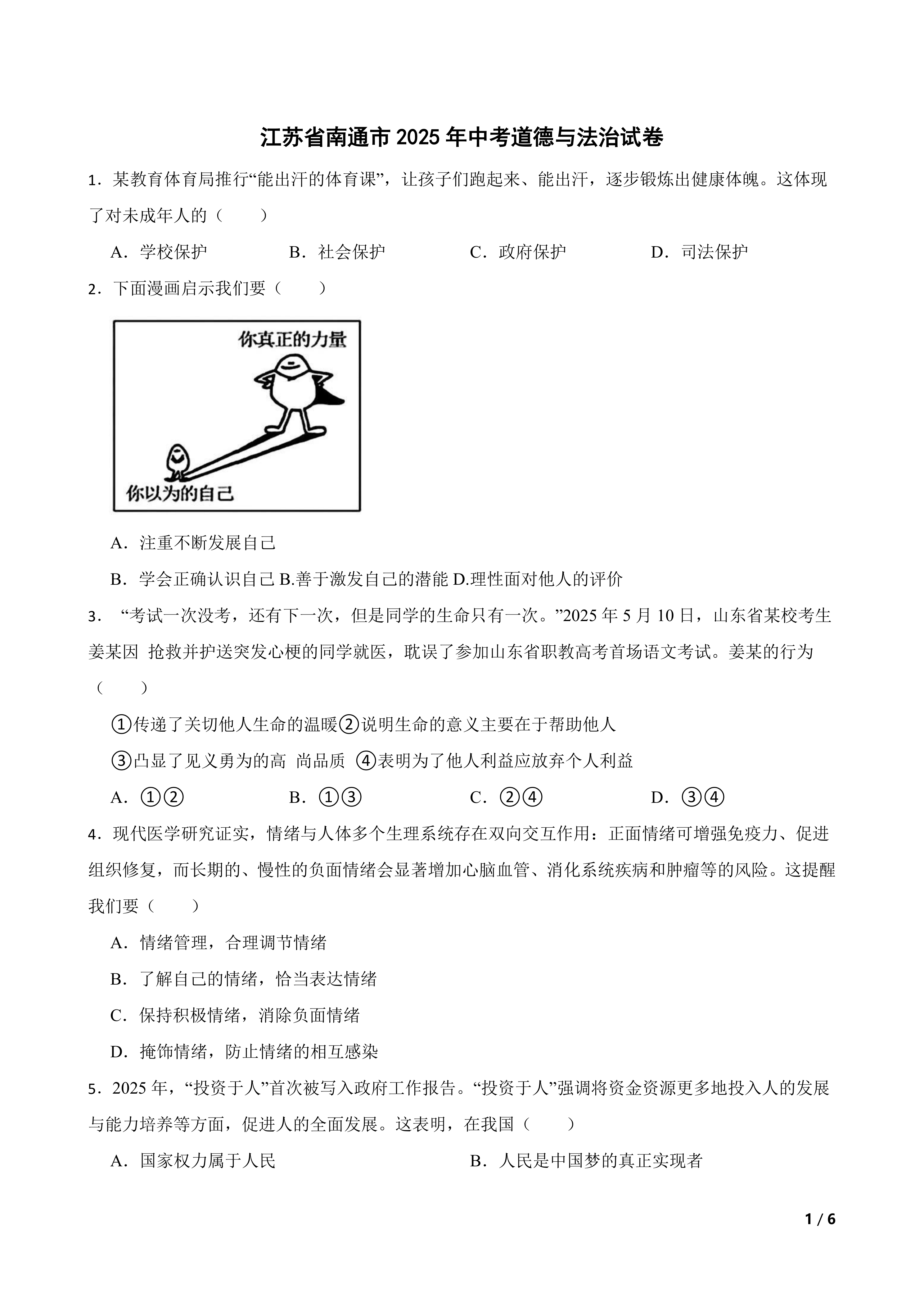 [中考真题]江苏省南通市2025年中考道德与法治试卷 时间:2025-10-27 热度:°C 加入收藏 我要投稿 点赞() 中考真题 上一篇:[中考真题]四川省巴中市2025年初中学业水平考试道德与法治真题 下一篇:返回列表