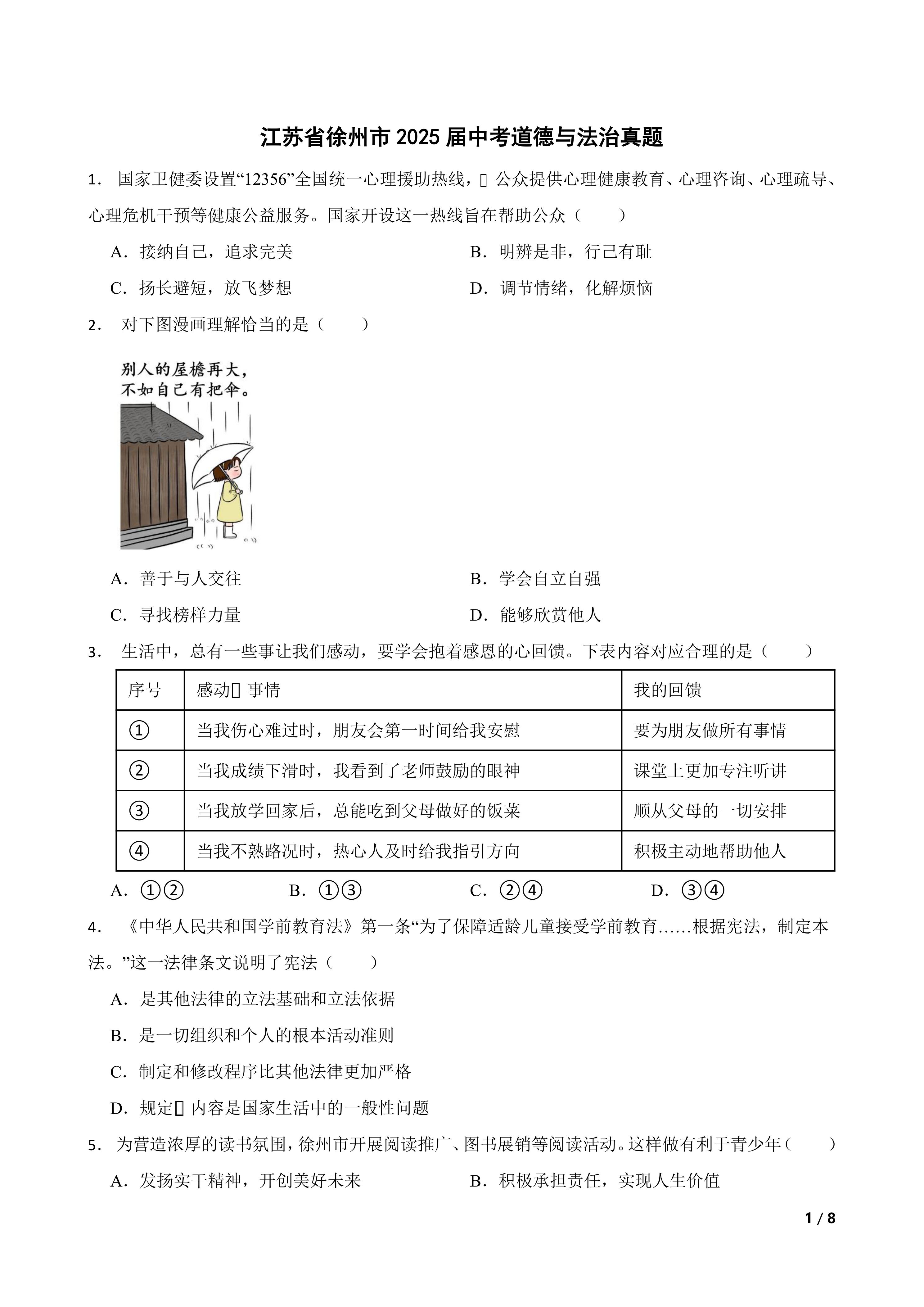 [中考真题]江苏省徐州市2025届中考道德与法治真题 时间:2025-10-27 热度:°C 加入收藏 我要投稿 点赞() 真题中考 上一篇:[中考真题]湖北省武汉市2025年中考道德与法治真题 下一篇:返回列表