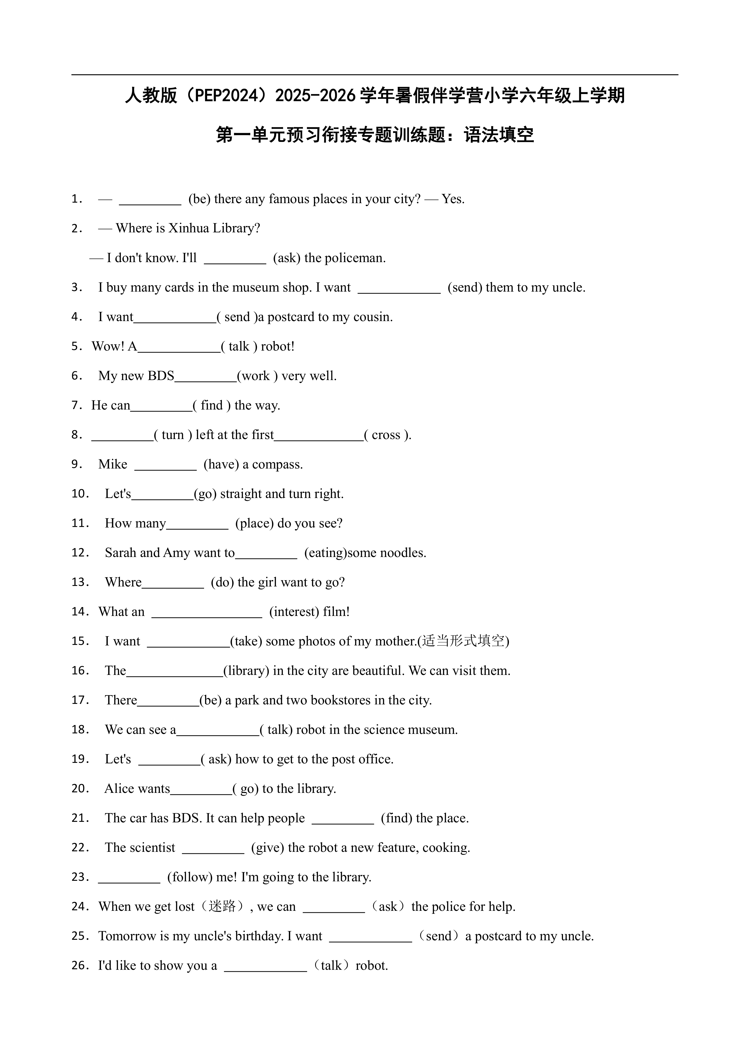 人教版(PEP2024)2025-2026学年暑假伴学营小学六年级上学期第一单元预习衔接专题训练题:语法填空(附答案) 时间:2025-10-27 热度:°C 加入收藏 我要投稿 点赞() 填空人教版 上一篇:外研版2022-2023学年小升初英语《书面表达》专项总复习 下一篇:返回列表